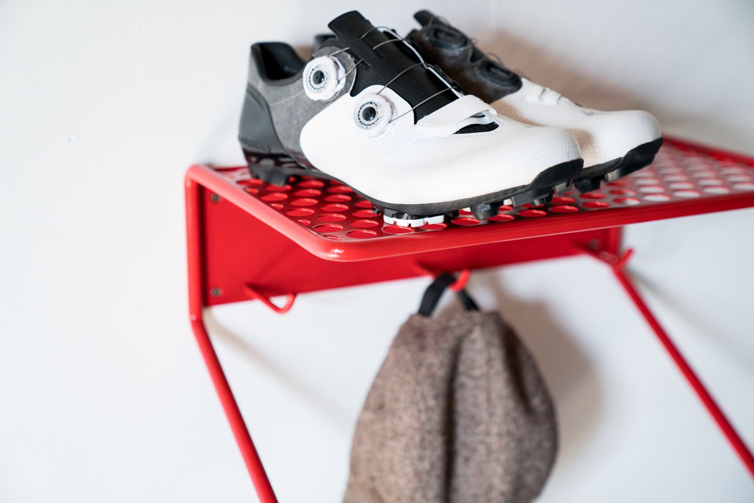 A clean, simple, modern take on a bike rack/self. Perfect for your home, office and garage. This is versatile rack and can be used you hang your jersey, bibs, caps, etc. As well as a shelf to store your shoes, helmet, or anything else you desire. Made out of 1/2" steel round, perforated steel and and natural veg tanned leather so that your bikes paint doesn't get damaged. Powder coated for durability and a pop of color.