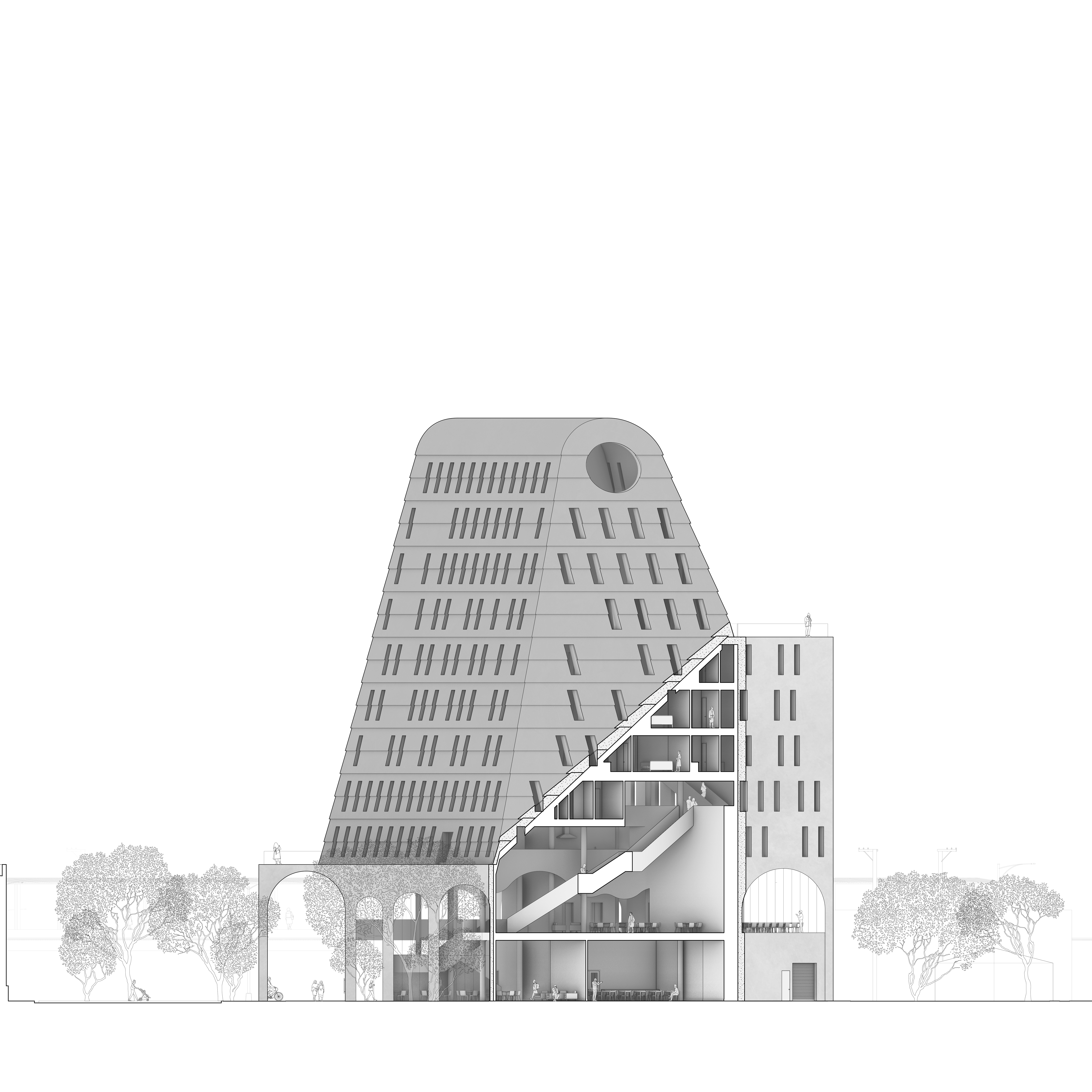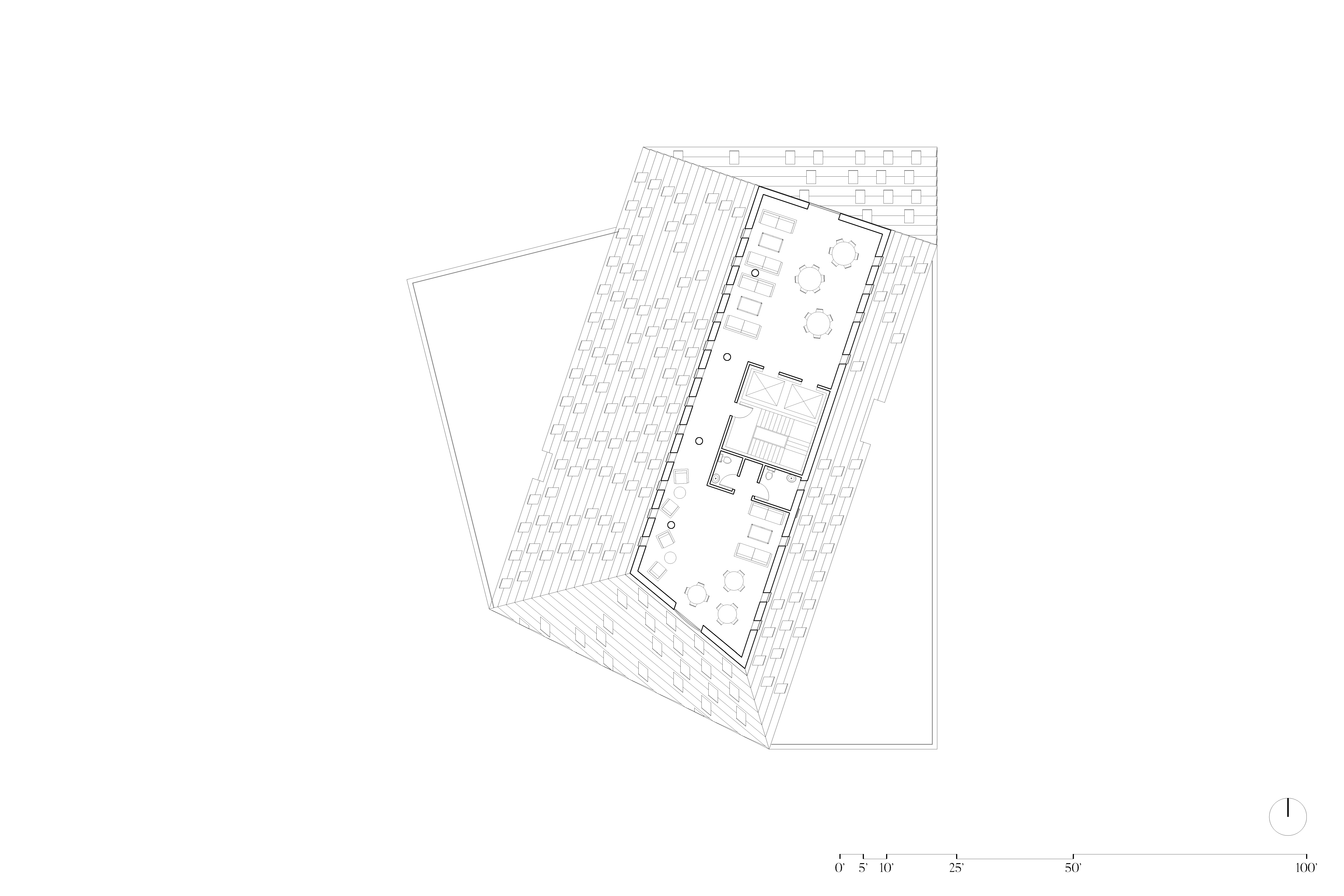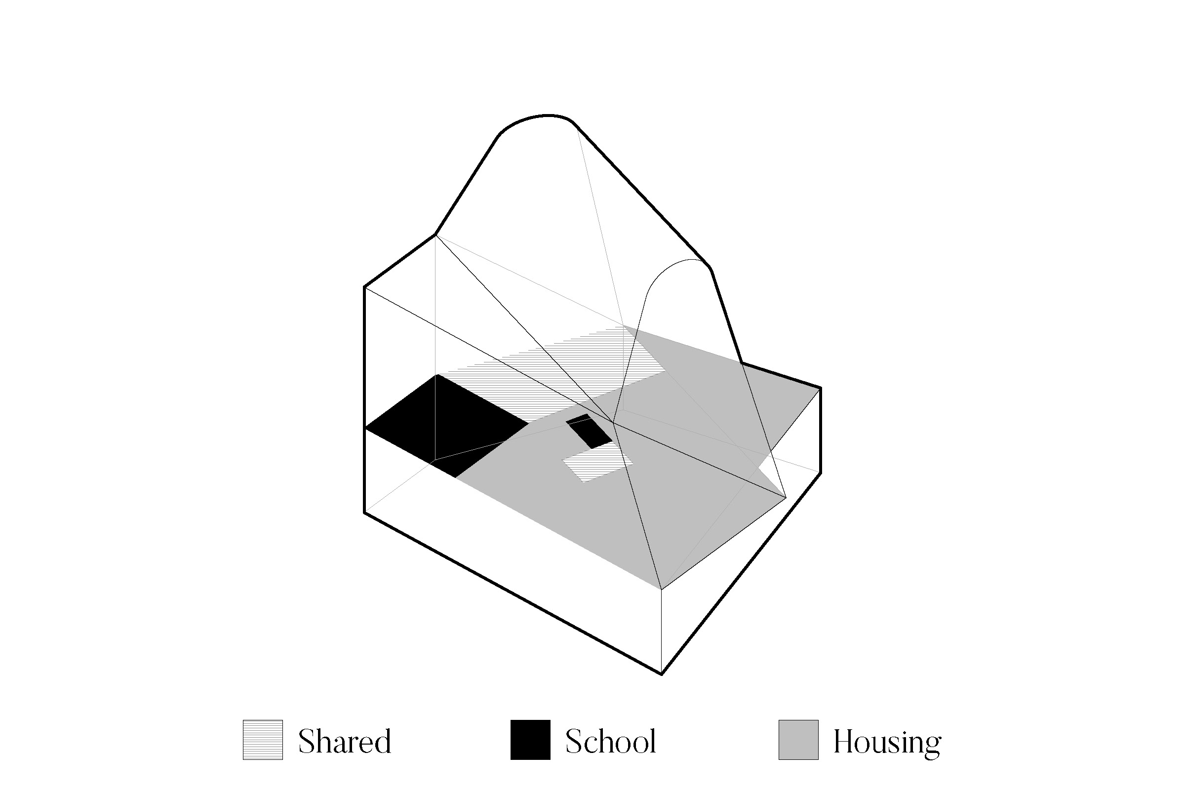 Cues taken from the immediate context influenced the formal features of the structure. To reduce the imposition of the building on its residential neighbors, the bulk of the vertical program was pulled back to align with the homes on the side street. At the average height of these single-family homes the façade begins to taper, giving it a roof-like appearance, reducing the perceived scale of the structure. I envisioned this façade to be constructed from large GFRC panels modeled after abstracted cedar shingles, adding to its roof like appearance. The plinth this “roof” sits on also angles away from the streets surrounding the site. An arched opening is cut through to connect the two streets. The arches were used intending to infer the public nature of the building.