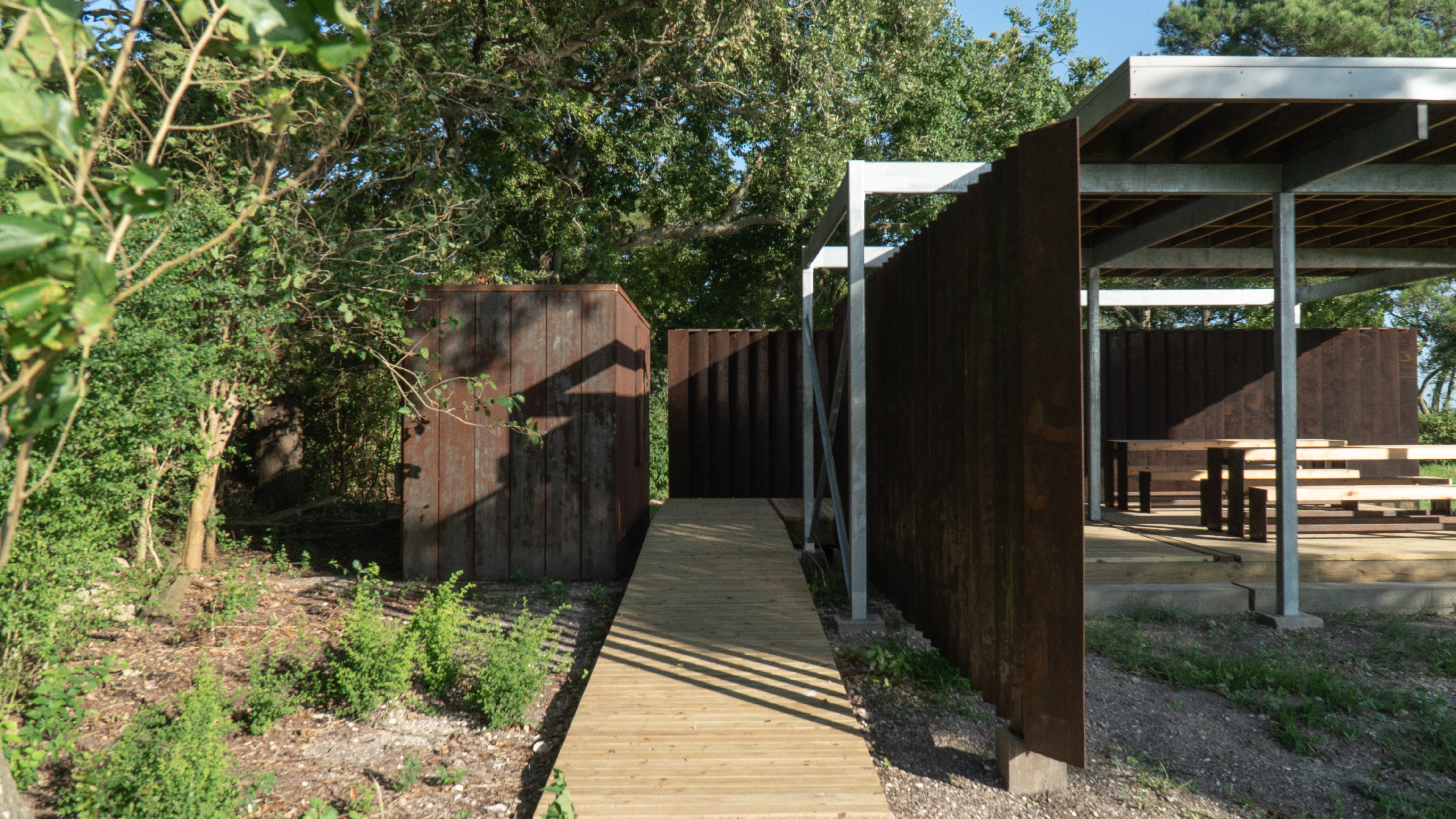 The stakeholder asked that the design be architecturally inspiring and reflect their aspirations of making the bay a better place for the seven million people who live in the surrounding area. The students selected the name shift because each plane of the project shifts from its accustomed location and was created as a symbol of the experience they wanted to bring. In disaster-stricken areas, students and children become traumatized by water. This pavilion serves as a way for them to move out of their comfort zones and shift into a different mindset. Screens slip away from the deck and don’t engage its edges. Portions of the structural frame slide past the deck and into the lawn. The roof shifts out over the lawn and covers both raised deck and the grass, and as one moves throughout the project, views through the screens shift. Finally, even the metal screens themselves shift over time. As they patina, their color will change, and the pavilion, will change alongside the students who inhabit it.